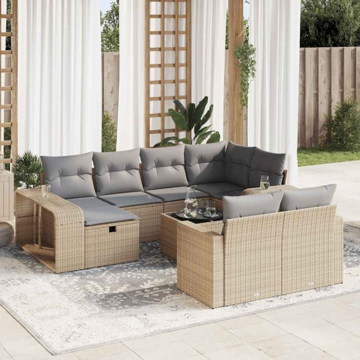 Aprašymas / vidaXL Sodo komplektas su pagalvėlėmis, 11 dalių, smėlio, poliratanas