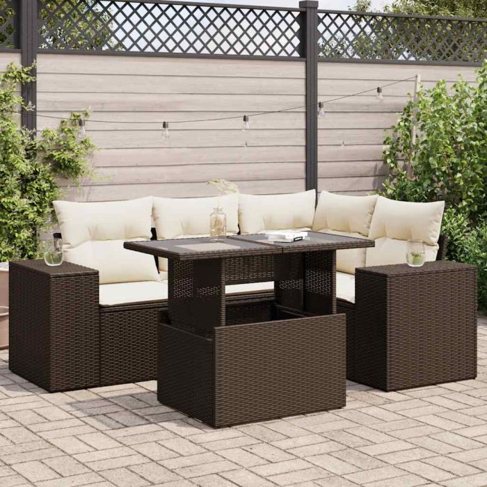 Aprašymas / vidaXL Sofos komplektas su pagalvėlėmis, 5 dalių, rudas, poliratanas