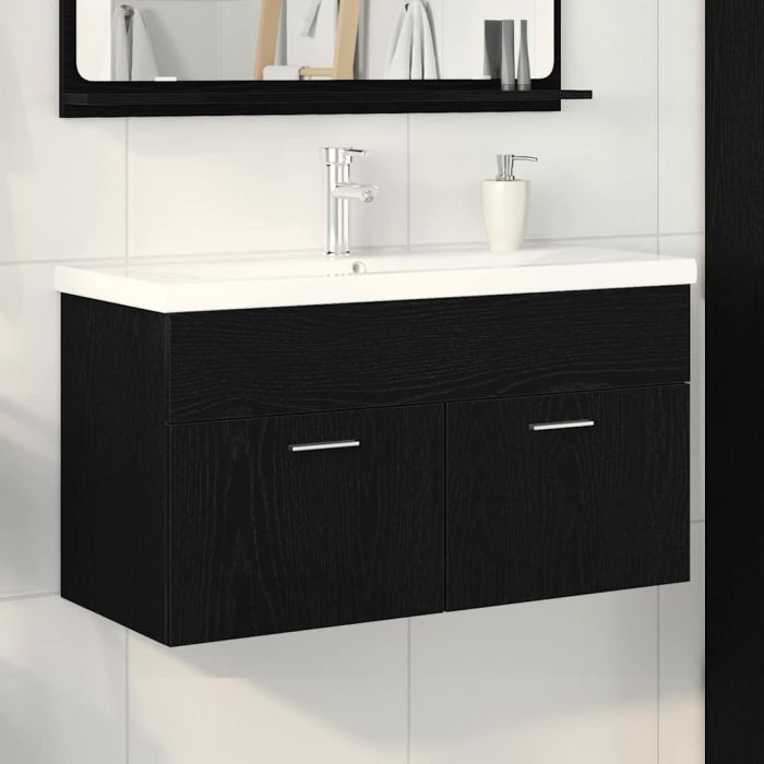 Aprašymas / vidaXL Vonios spintelė su stalčių Juodas ąžuolas 90 x 38,5 x 46 cm